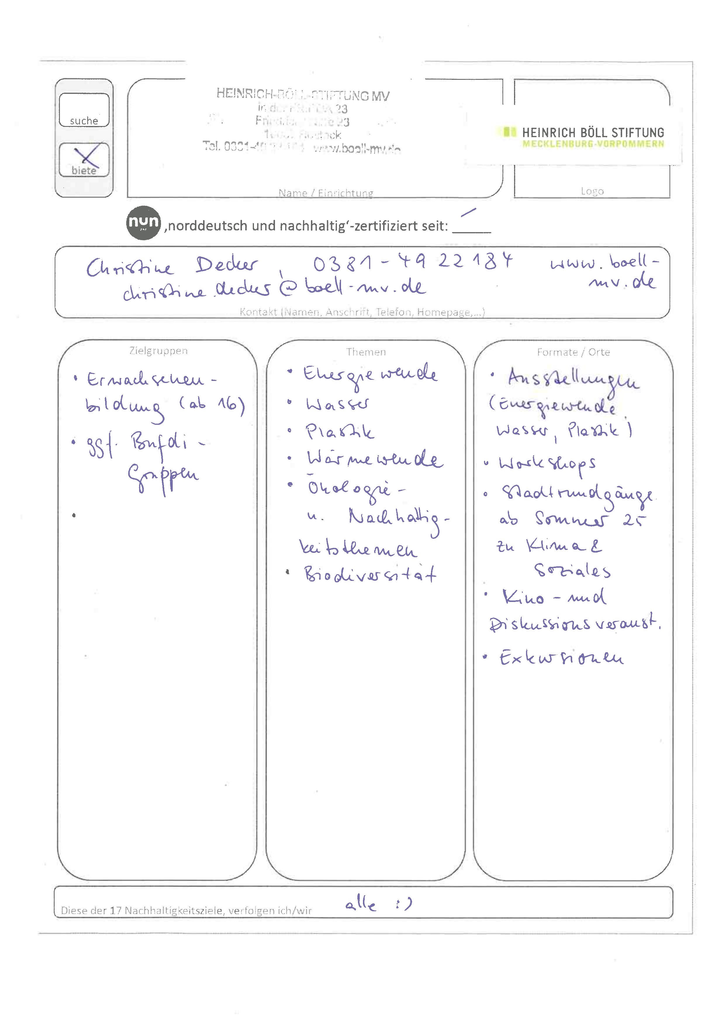 - 'norddeutsch und nachhaltig' (nun)-Zertifizierung, wo ganzheitlich nachhaltig Bildungsanbietende von Rostock (und M-V) zu finden sind