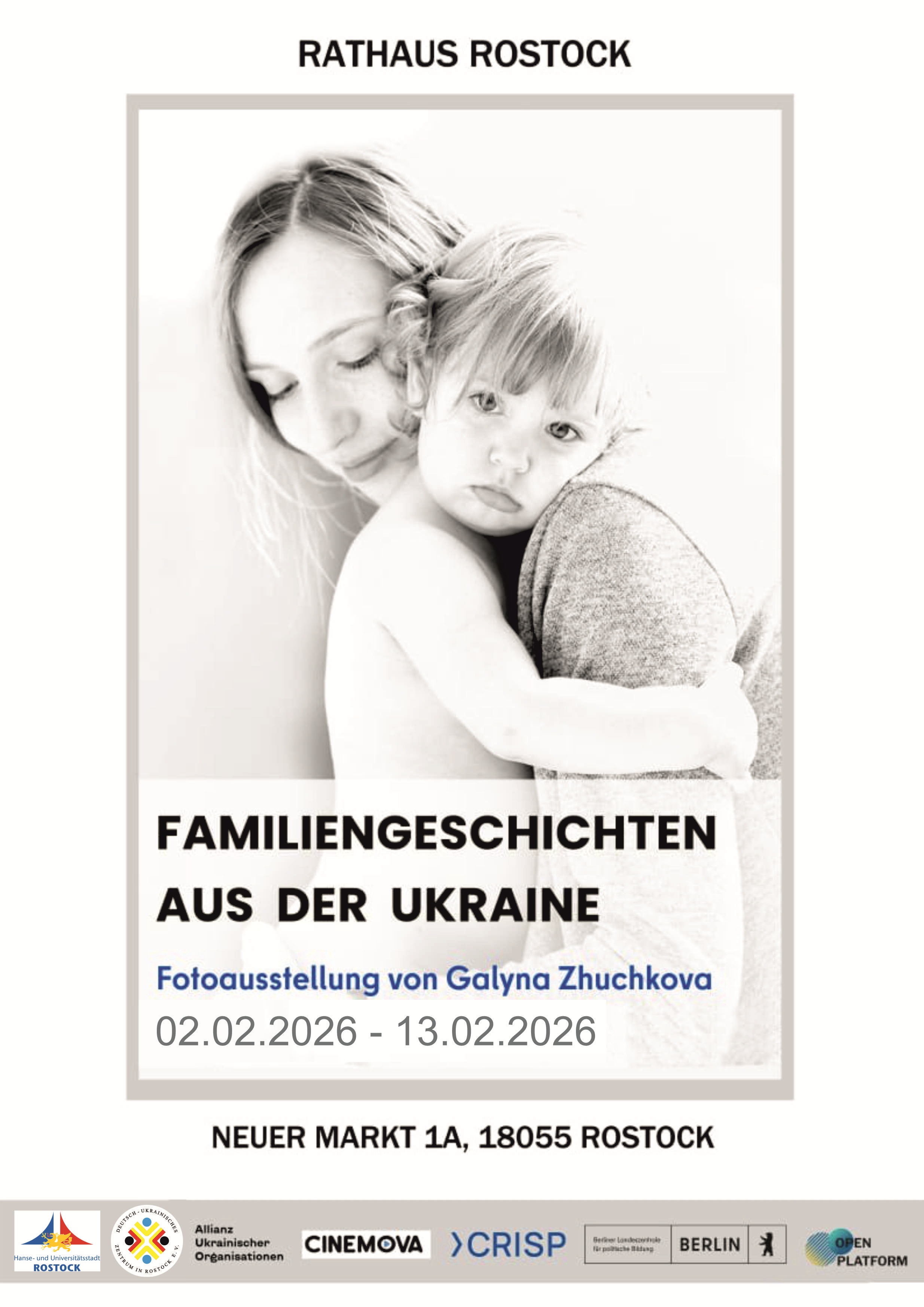 Die Gemeinnützige Organisation Deutsch-Ukrainisches Zentrum Rostock, die seit über fünf Jahren Integrations-, soziale und kulturelle Projekte in Rostock und der Region umsetzt, zeigt im Rathaus die Fotoausstellung der Künstlerin Galyna Zhuchkova aus Berlin. Sie widmet sich Familien, die vom Krieg betroffen sind, und zeigt eindrücklich, wie der Krieg das Leben ganz gewöhnlicher Menschen verändert.