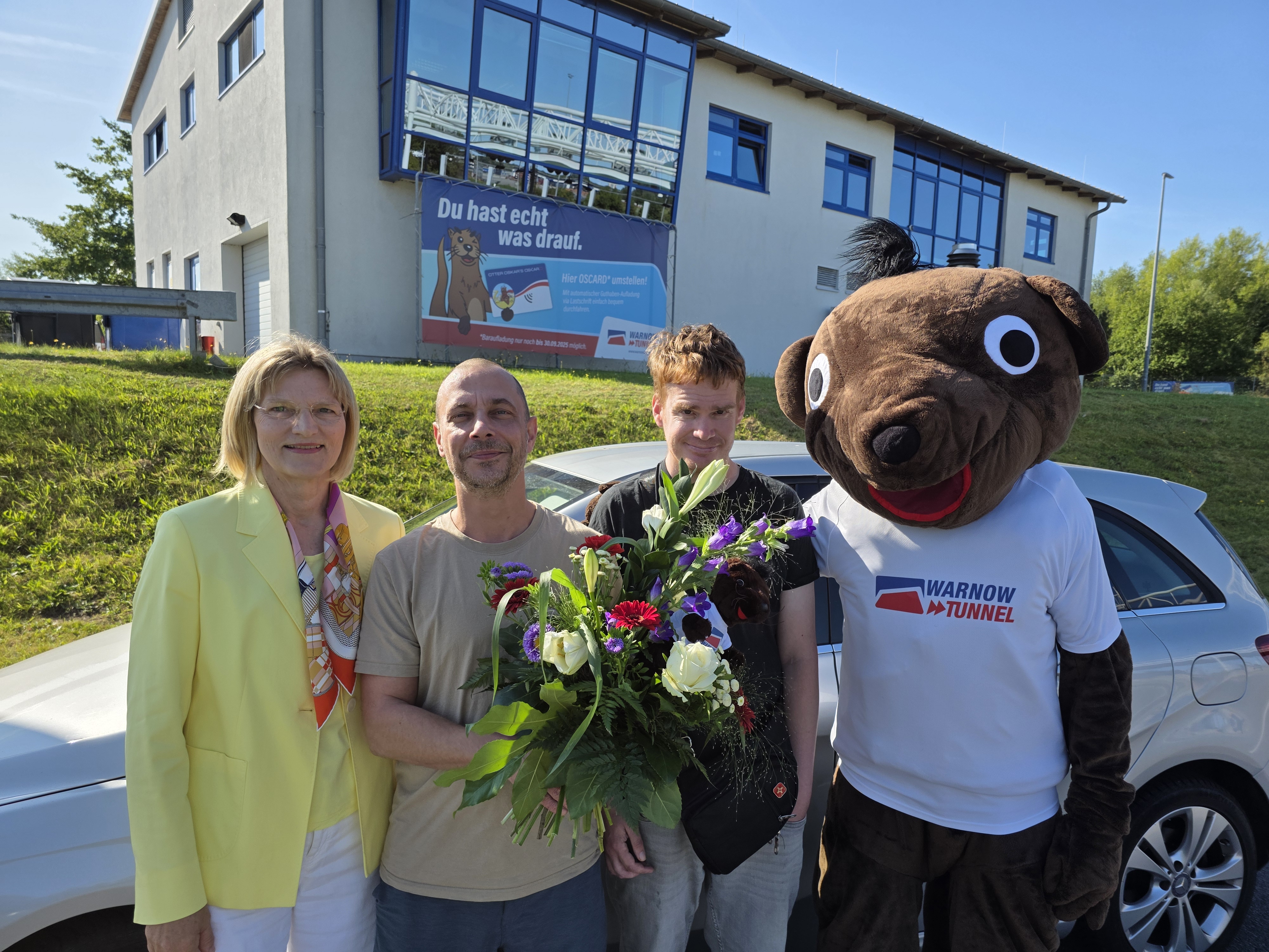 In diesem Fahrzeug saßen Till Meyn und Christoph Schulze. Die jungen Herren vom Michaelshof in Rostock-Gehlsdorf wurden bei ihrer Durchfahrt von einem Empfangskomitee der Warnowquerung GmbH & Co. KG überrascht und beglückwünscht. Von der Geschäftsführerin des Tunnels, Frau Yvonne Osterkamp, und dem Maskottchen Otter Oskar wurden als Dankeschön zahlreiche und tolle Geschenke überreicht. Die Herren durften sich über einen großen Blumenstrauß mit einem kleinen Otter-Plüschtier, einen Tankgutschein im Wert von 90,00 €, zwei Eintrittskarten für den Rostocker Zoo, ein Warnowtunnel-Induktionsladepad und weitere feine Präsente freuen.