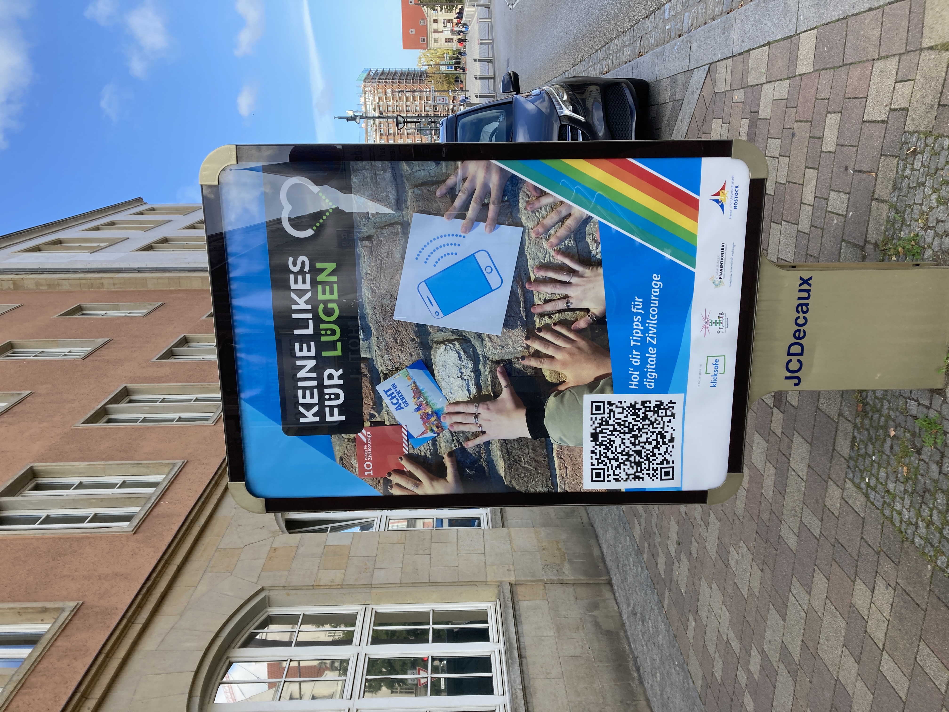 Die Öffentlichkeitskampagne „Keine Likes für Lügen“ möchte zu den aktuellen und problematischen Themen – Hass, Hetze und Desinformationen im digitalen Raum – sensibilisieren, zum Nachdenken anregen und Handlungstipps im Umgang mit Falschmeldungen und extremistischen Inhalten geben. Mithilfe eines QR-Codes können sich junge Menschen darüber hinaus über digitale Infokarten der EU-Initiative klicksafe niedrigschwellig über manipulative Inhalte und extremistische Narrative im Netz aufklären. Sie erhalten dort kompakte Informationen, Tipps und Hinweise zu weiterführenden Informations- und Hilfsangeboten. Mithilfe der Kampagne sollen demokratische Werte gefestigt und Demokratiekompetenz im digitalen Raum bei jungen Menschen gefördert werden. Die durchgeführte Plakataktion wurde durch den Kommunalen Präventionsrat (KPR) in Kooperation mit dem Jugendamt der Hanse- und Universitätsstadt Rostock organisiert und durchgeführt.