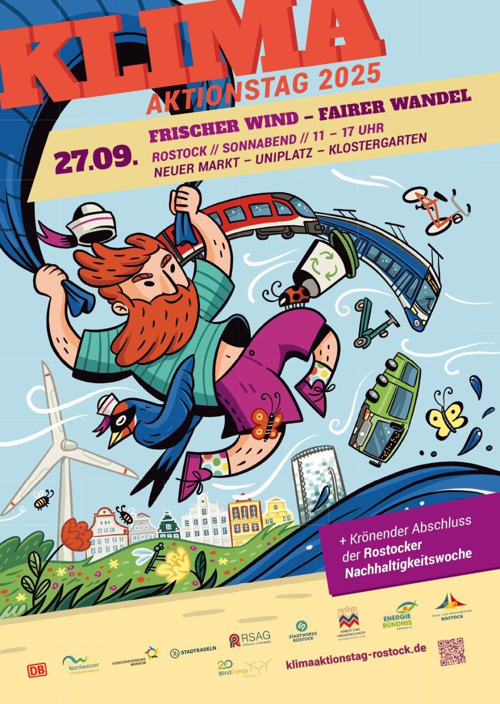 Höhepunkt und Finale der Nachhaltigkeitswoche ist der Klima-Aktionstag am Sonnabend, 27. September 2025, von 11 bis 17 Uhr. Unter dem Motto „Frischer Wind – Fairer Wandel“ präsentieren lokale Initiativen, Unternehmen, Vereine und Institutionen vom Neuen Markts über den Universitätsplatz bis hin zum Klostergarten ihre Projekte. Dort zeigen sie, wie sie Nachhaltigkeit praktisch leben und den Klimaschutz aktiv gestalten. Besucherinnen und Besucher erwarten zahlreiche Infostände, Mitmachaktionen, eine Ausstellung, kurze Vorträge, ein Flohmarkt, eine Jobbörse, Auszeichnungen, Programme auf zwei Bühnen und Angebote für die ganze Familie.