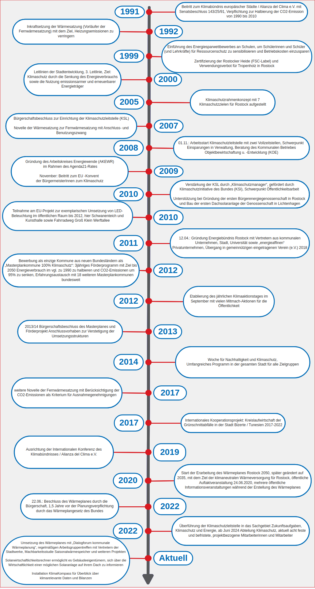 Seit mehr als drei Jahrzehnten engagiert sich die Hanse- und Universitätsstadt Rostock aktiv für den Klimaschutz und eine nachhaltige Stadtentwicklung. Bereits 1991 trat Rostock mit dem Senatsbeschluss 143/25/91 dem Klimabündnis europäischer Städte / Alianza del Clima e.V. bei und verpflichtete sich, die CO₂-Emissionen bis 2010 im Vergleich zu 1990 zu halbieren. Ein Jahr später folgte mit der Einführung der Wärmesatzung - dem Vorläufer der heutigen Fernwärmesatzung - ein weiterer wichtiger Schritt zur Verringerung der Heizungsemissionen.