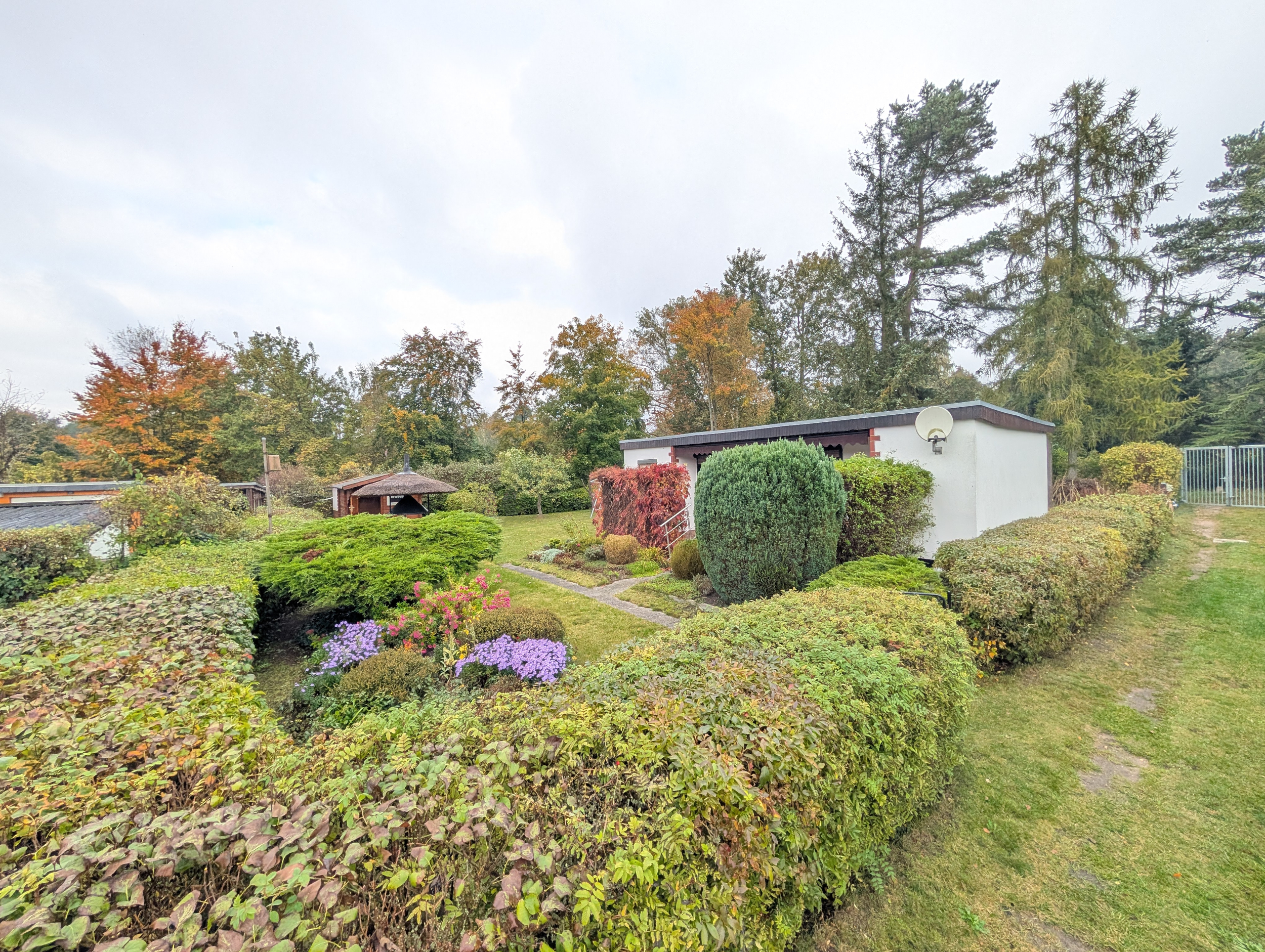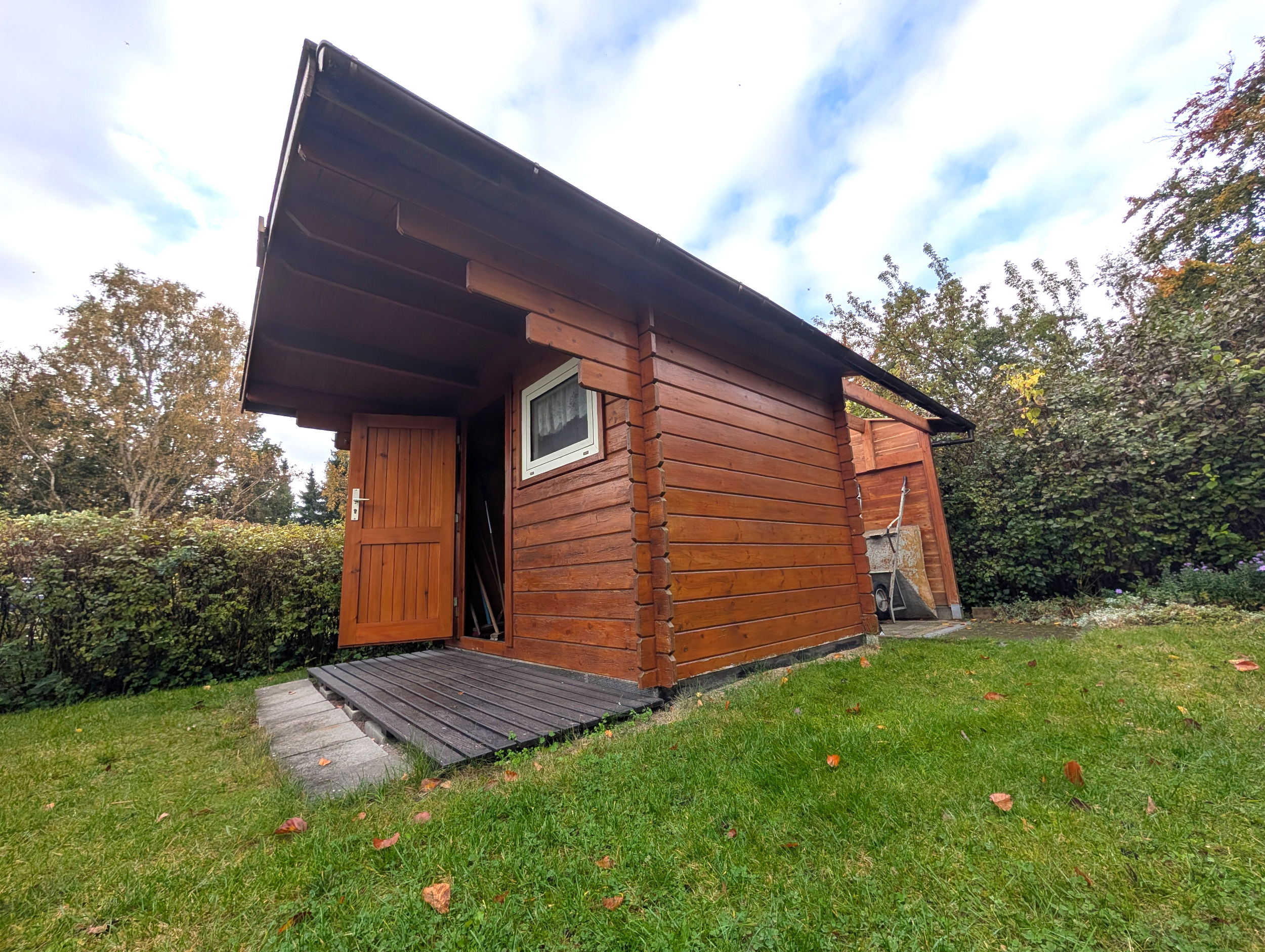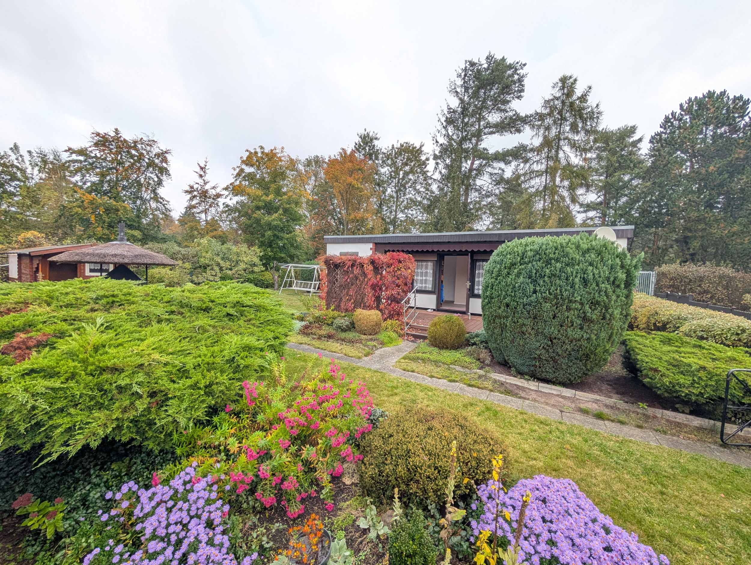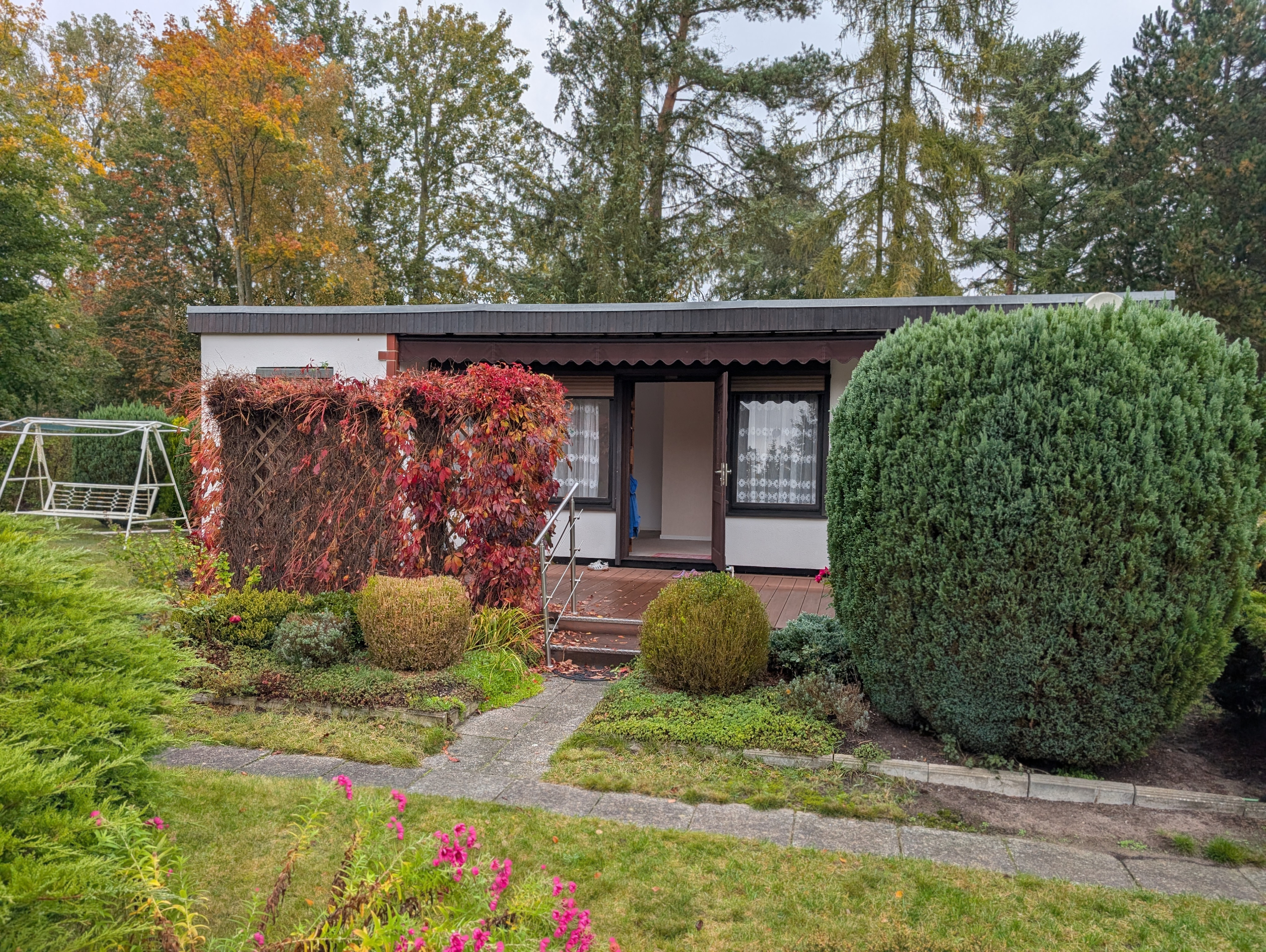 Das eingeschossige Wochenendhaus mit Flachdach, wurde ca. 1976 errichtet und hat eine Nutzfläche von ca. 43 m² und eine teilüberdachte Terrasse. Das in Holzrahmenbauweise errichtete und mit massiven Anbauten erweiterte Gebäude beinhaltet ein Wohnzimmer, ein Kinderzimmer sowie ein Schlafzimmer. Das Wochenendhaus besitzt Holzfenster mit einfacher Verglasung, aktuell ist keine Heizung vorhanden. Die Warmwasseraufbereitung erfolgt über eine Elektrotherme. Das Bad besitzt eine Dusche, ein Stand-WC und ein Waschbecken. Eine kleine Einbauküche ist vorhanden. An der Rückseite des Objektes befindet sich ein Hauswirtschaftsraum. Das Gebäude wurde in den zurückliegenden Jahren nicht wesentlich modernisiert, jedoch laufend instandgehalten. Der Anschluss des Mietgrundstückes an das Breitbandnetz wurde bereits vorbereitet. Mit dem Erwerb des Wochenendhauses werden ebenfalls ein Holzschuppen, ein Grillplatz sowie die Anpflanzungen, Einfriedungen und die zur Versorgung des Grundstückes notwendigen vorhandenen Versorgungsleitungen erworben.