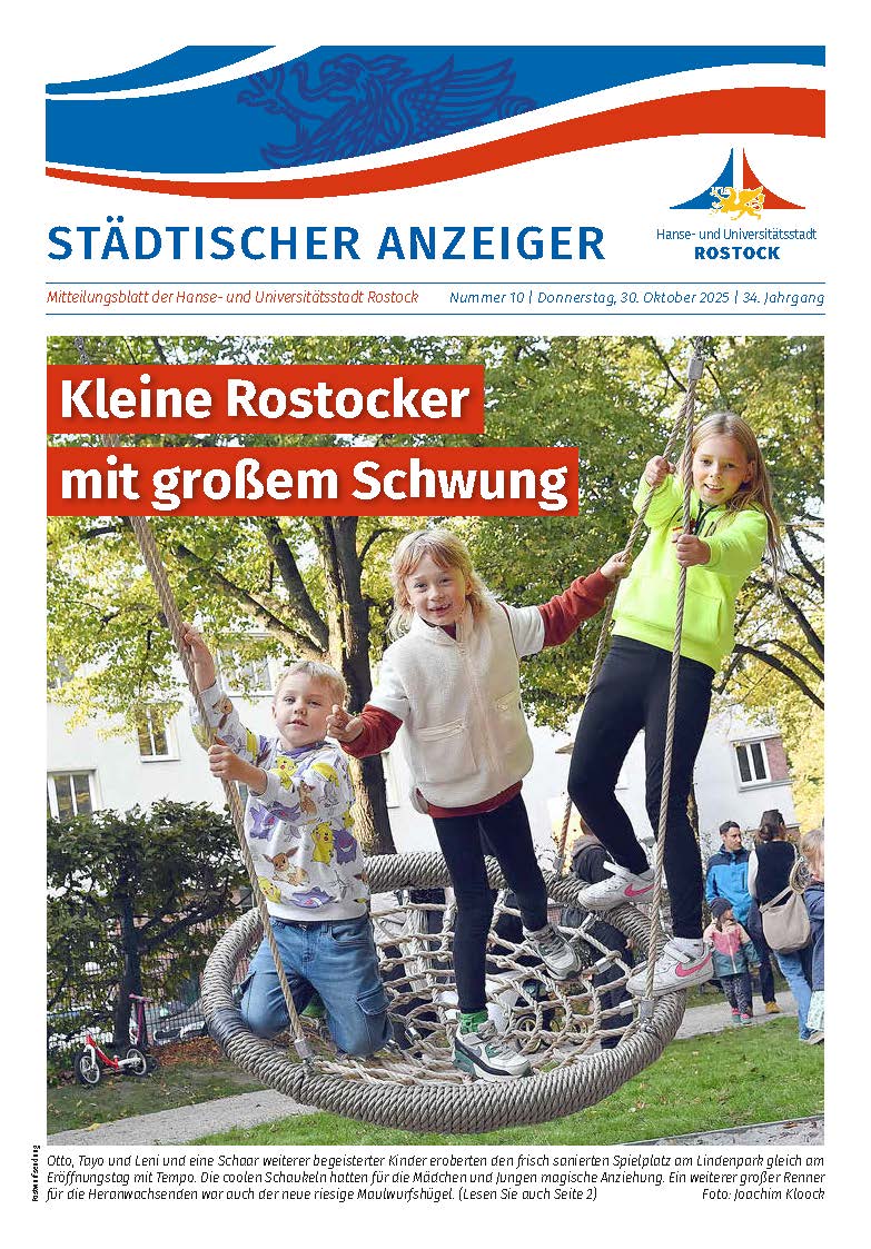 Die Oktober-Ausgabe des „Städtischen Anzeigers“ ist jetzt erschienen. Das Mitteilungsblatt der Stadtverwaltung informiert auf 20 Seiten unter anderem über den kommunalen Haushaltsplanentwurf 2026/2027, das 1. Rostocker KONservatoriumskonzert, den Schmarler Kulturherbst und Veranstaltungen für Pflegeeltern.