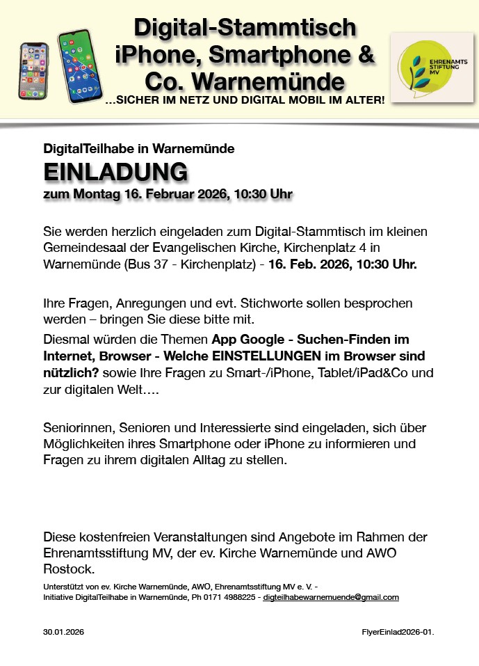 Der nächste Digital-Stammtisch für Seniorinnen und Senioren in Warnemünde ist am Montag, 16. Februar 2026, um 10.30 Uhr im Gemeindesaal der Evangelischen Kirche Warnemünde, Kirchenplatz 4, geplant. Darauf weist der Ortsbeirat Warnemünde/ Diedrichshagen hin. Der Raum befindet sich im ersten Obergeschoss und ist auch mit einem Fahrstuhl erreichbar.
