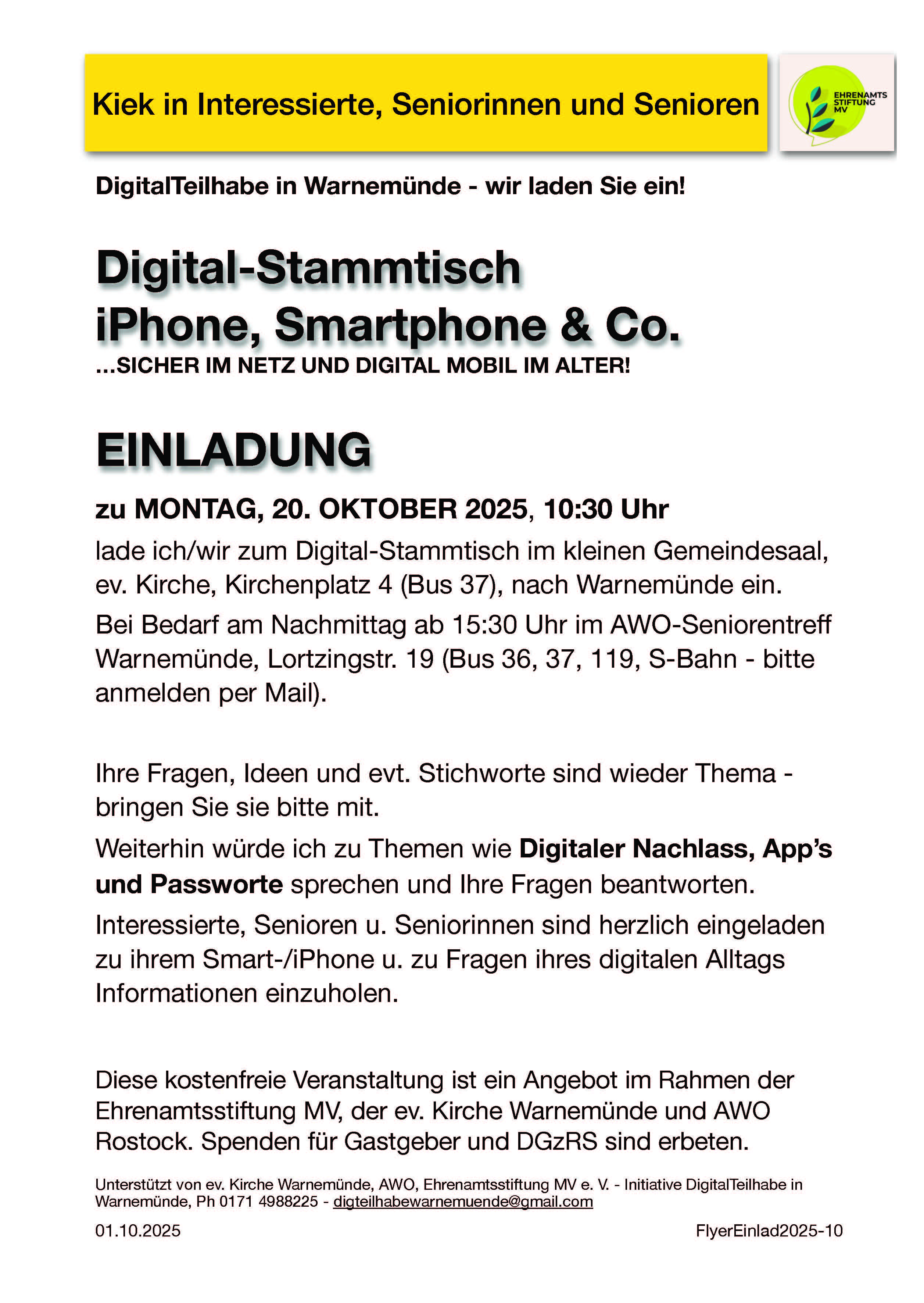 Der nächste Digital-Stammtisch für Seniorinnen und Senioren in Warnemünde ist am Montag, 20. Oktober 2025, um 10.30 Uhr im Gemeindesaal der Evangelischen Kirche Warnemünde, Kirchenplatz 4, geplant. Darauf weist der Ortsbeirat Warnemünde/ Diedrichshagen hin. Der Raum befindet sich im ersten Obergeschoss und auch mit einem Fahrstuhl erreichbar.