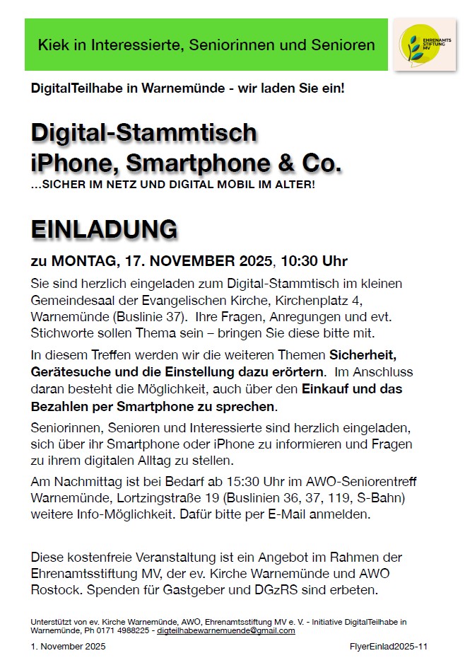 Der nächste Digital-Stammtisch für Seniorinnen und Senioren in Warnemünde ist am Montag, 17. November 2025, um 10.30 Uhr im Gemeindesaal der Evangelischen Kirche Warnemünde, Kirchenplatz 4, geplant. Darauf weist der Ortsbeirat Warnemünde/ Diedrichshagen hin. Der Raum befindet sich im ersten Obergeschoss und ist auch mit einem Fahrstuhl erreichbar.
